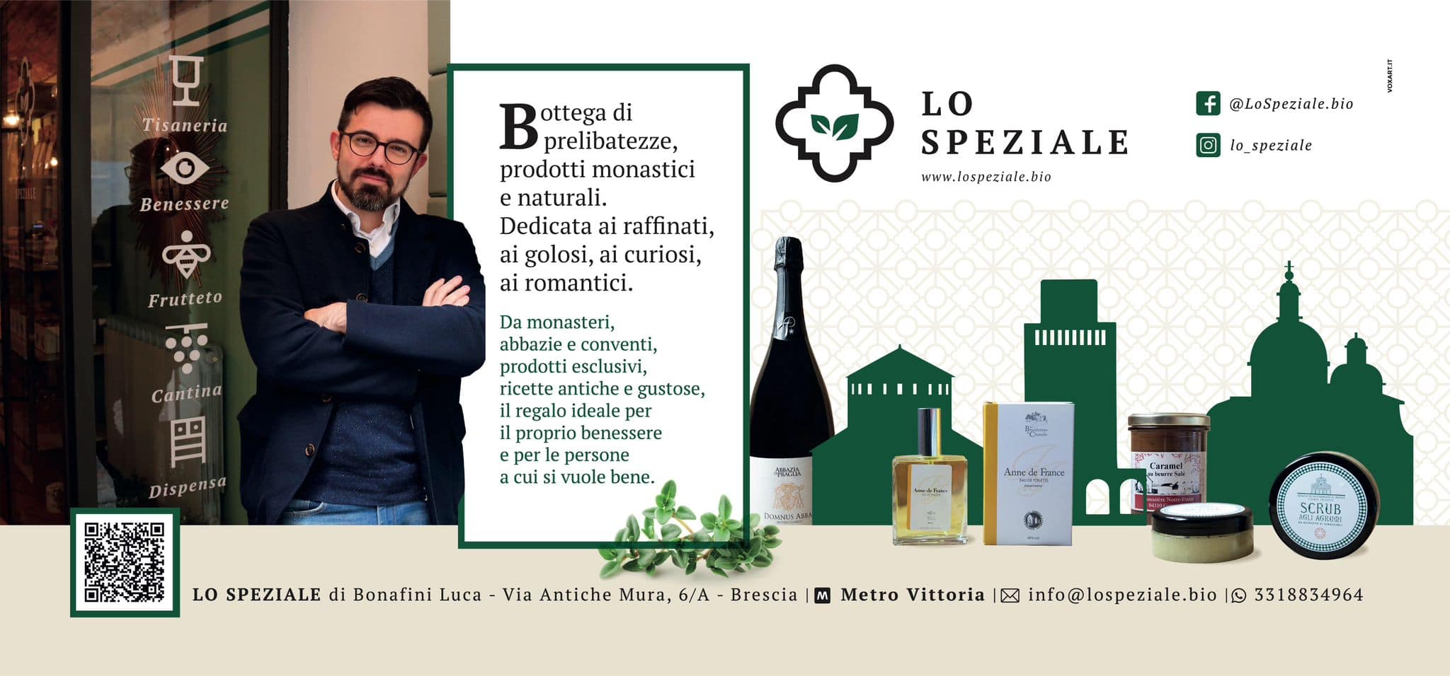 Dalla Valeriana del Monastero S. Scolastica di Subiaco per le notti in cui i grilli sono troppo rumorosi e non si riesce a prendere sonoo al Tonico per i muscoli dei Giardini Aromatici Wipptal o con Crema piedi all’ippocastano del Monastero di Valserena per un massaggio dopo un trekking in montagna. Preparatevi a trascorrere almeno un’ora tra scaffali, vetrine e a farvi raccontare la storia che si cela dietro ogni prodotto da Luca. Infine richiedete la mappa per visitare Brescia, dove trovate tutte le informazioni per visitare 68 punti storici della città.