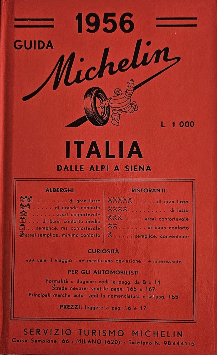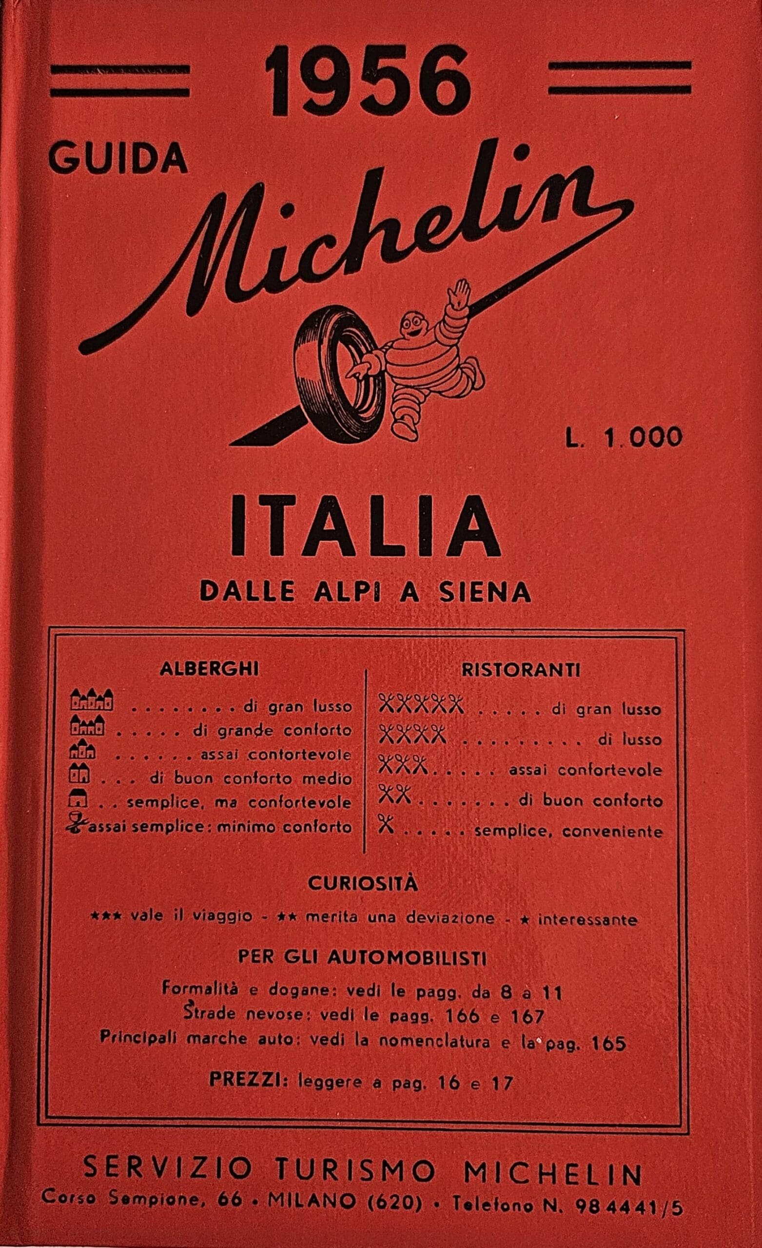 La Guida MICHELIN Italia nasce nel 1956, con il titolo Dalle Alpi a Siena. Ogni edizione nasconde, tra i simboli e le pagine, storie antiche, di famiglie che offrono piatti dalle ricette tradizionali e di un’Italia che rinasce dopo la guerra. Tra queste, c’è la storia di Arnaldo Degoli, che nasce a Rubiera il 28 ottobre del 1907 da genitori custodi di un podere di contadini. Insieme a Lina, Arnaldo apre il ristorante dandogli il proprio nome. Sarà una delle 81 stelle del 1959 e la più longeva. L’attuale Arnaldo Clinica Gastronomica brilla ancora oggi di una stella, dopo oltre 60 anni. Storie d’Italia, e di come si viaggiava settant’anni fa. La Guida del ’56 è fonte di sorprendenti curiosità: nella pagina delle Formalità per gli italiani che si recano all’estero, si scopre che per andare in Austria, Belgio, Francia, Svizzera e Germania non è necessaria la patente “per vettura propria”. Anche i primi simboli sono piccoli, ma espressivi testimoni dell’epoca: un termosifone indica la non scontata presenza di riscaldamento, una minuscola vasca il “Bidet con acqua corrente”, un rubinetto, una brocca con la bacinella e una candela “Solo acqua corrente fredda”, “Senza acqua corrente” e “Senza elettricità”. Dal 1957 la Guida copre tutto il territorio nazionale e nel 1959 compaiono le prime stelle. Sono stelle “uniche”: non esistono ancora le due e le tre stelle. Negli anni Sessanta, la cartina d’Italia nelle prime pagine rivela che l’autostrada Torino-Venezia è completata. Fa la sua apparizione il simbolo dell’aria condizionata e spariscono il rubinetto, la brocca con la bacinella e la candela. Dal 1969 brillano anche le due stelle: “Tavola eccellente: merita una deviazione”. Nel 1986 appare per la prima volta il simbolo delle tre stelle, “Una delle migliori tavole: vale il viaggio”, che incorona Gualtiero Marchesi. Già lontani i tempi dell’acqua fredda e del buio, l’Italia gode di buona salute e il cibo viene considerato non solo una necessità, ma un’esperienza di gusto: nelle prime pagine della guida si dà “Qualche consiglio sull’accostamento vini-vivande”. Negli anni Novanta compaiono i pittogrammi di “sauna” e “palestra”, mentre un Omino rosso ammiccante, il Bib Gourmand, segnala “Pasti accurati a prezzi contenuti”. Gli anni 2000 testimoniano, anche su carta, la tendenza ormai irrefrenabile all’uso di Internet, con il simbolo del wifi che porta l’azienda a lanciare il sito della Guida MICHELIN e, dieci anni fa, la versione digitale gratuita per tutti gli utenti.